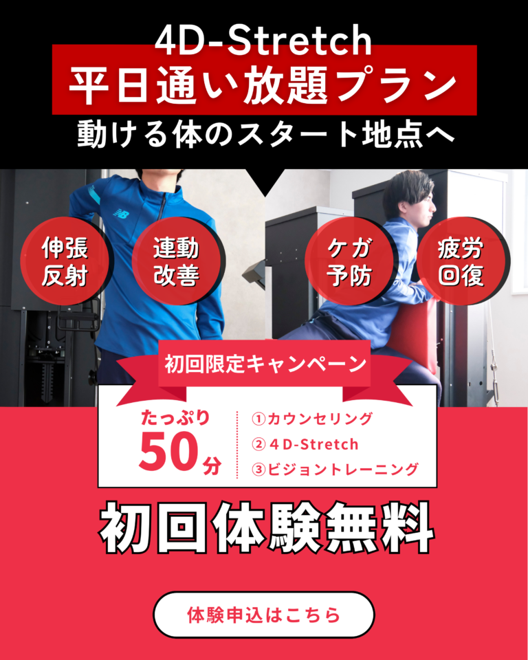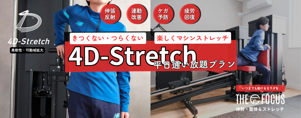 4D-Stretchによる可動性・動作の質の向上と、ケガをしにくい体づくりであなたの潜在能力を最大限に引き出し、目標達成への最短ルートを実現します。